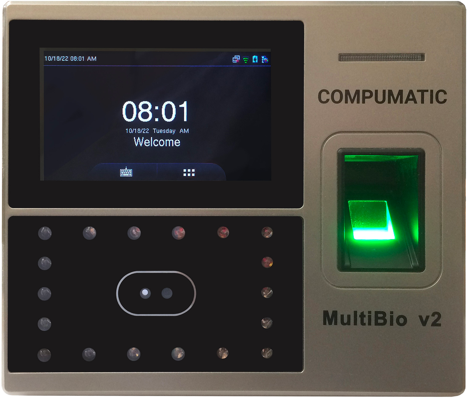 The Compumatic MultiBio connects to your network using Wi-Fi or ethernet. Employees clock by facing the dual cameras. Touch-free, and prevents buddy punching. Best choice multiple biometric options.